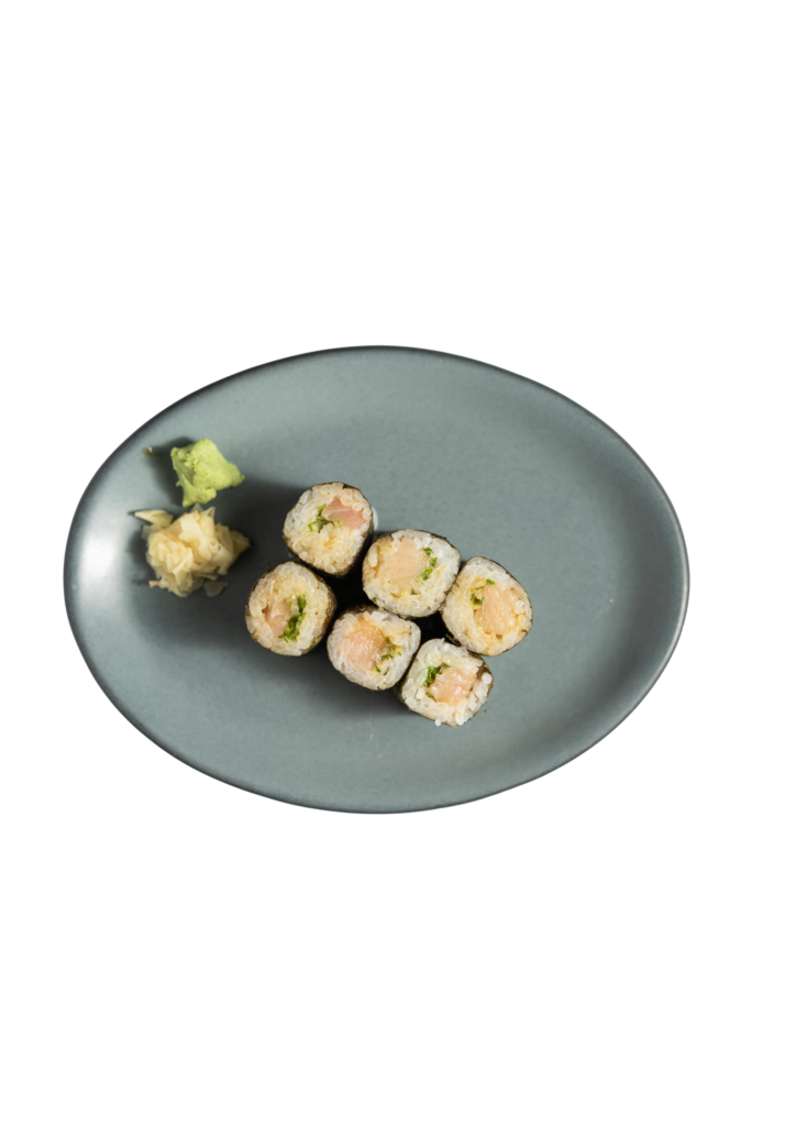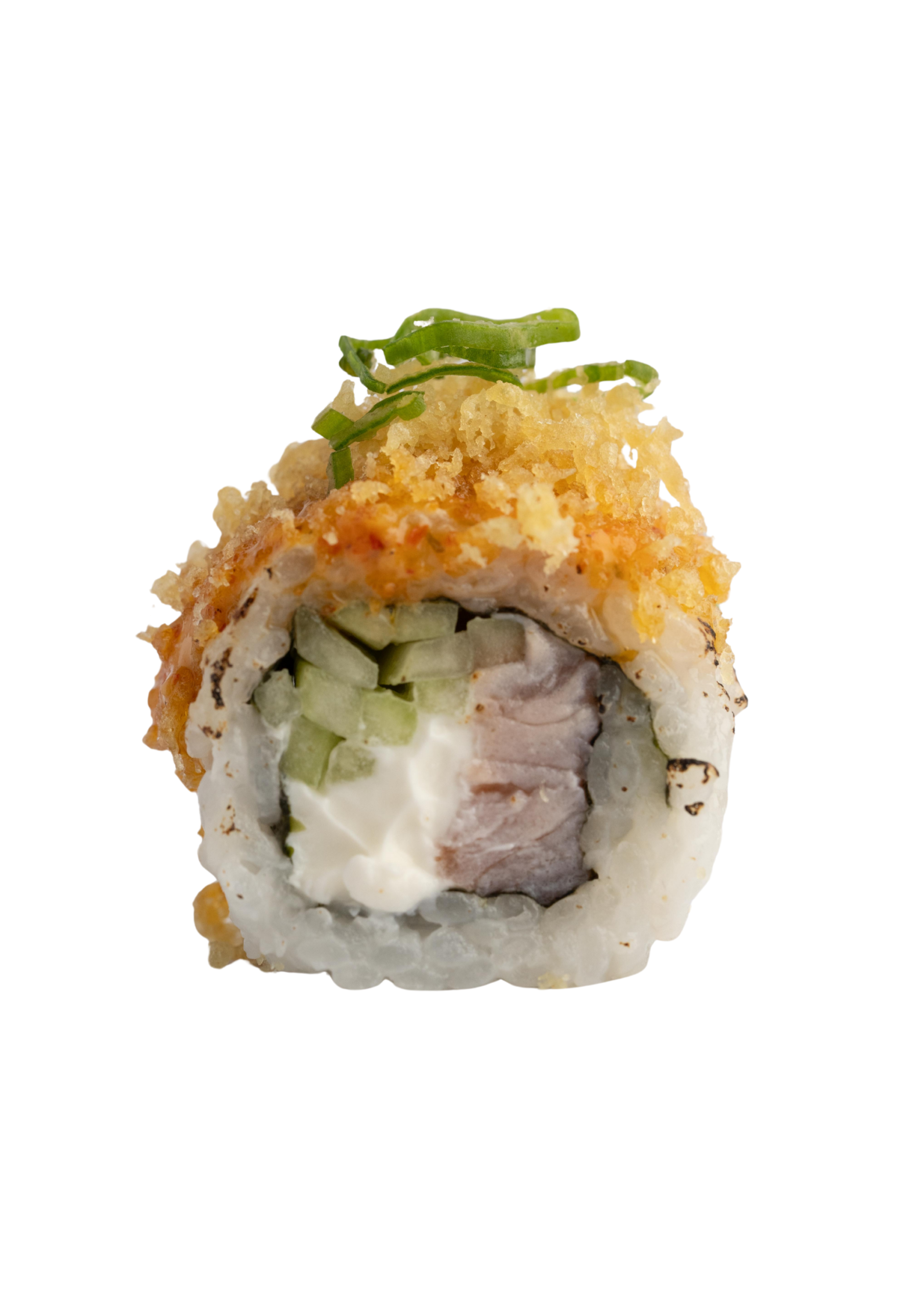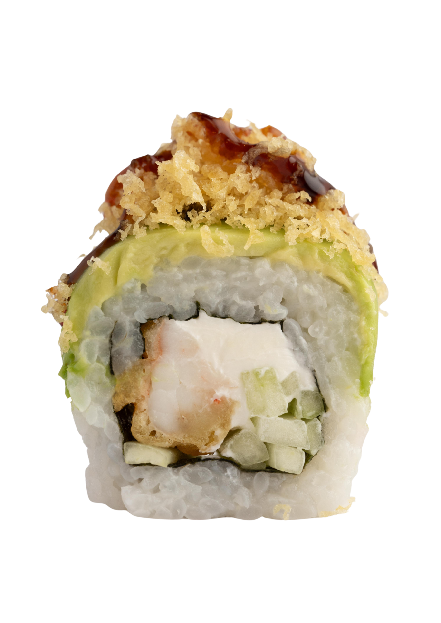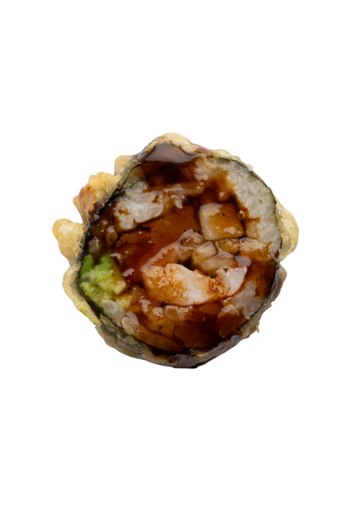 Arroz, cortes delgados de pollo salteado en salsa teriyaki , aguacate, cebollín y ajonjolí.