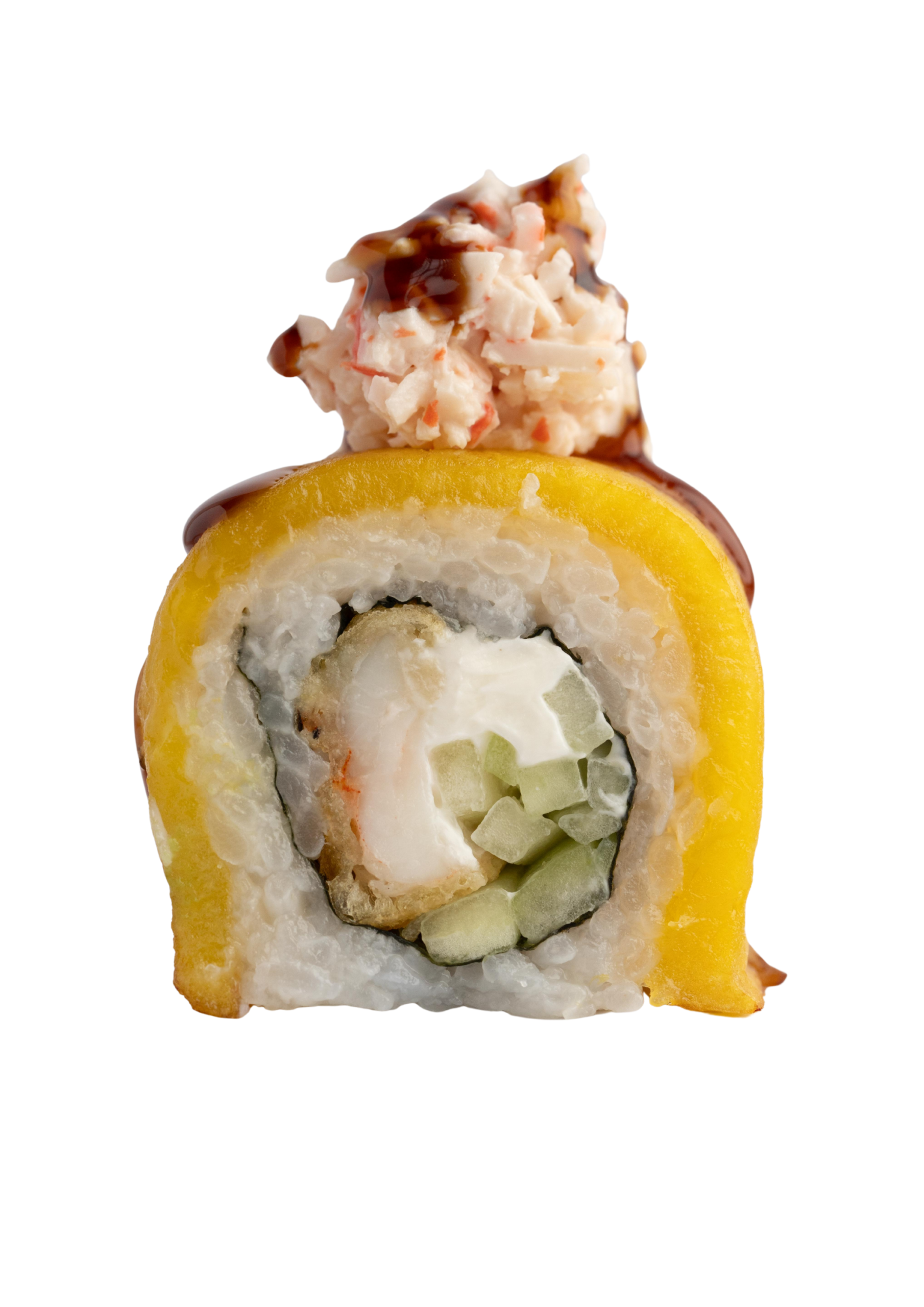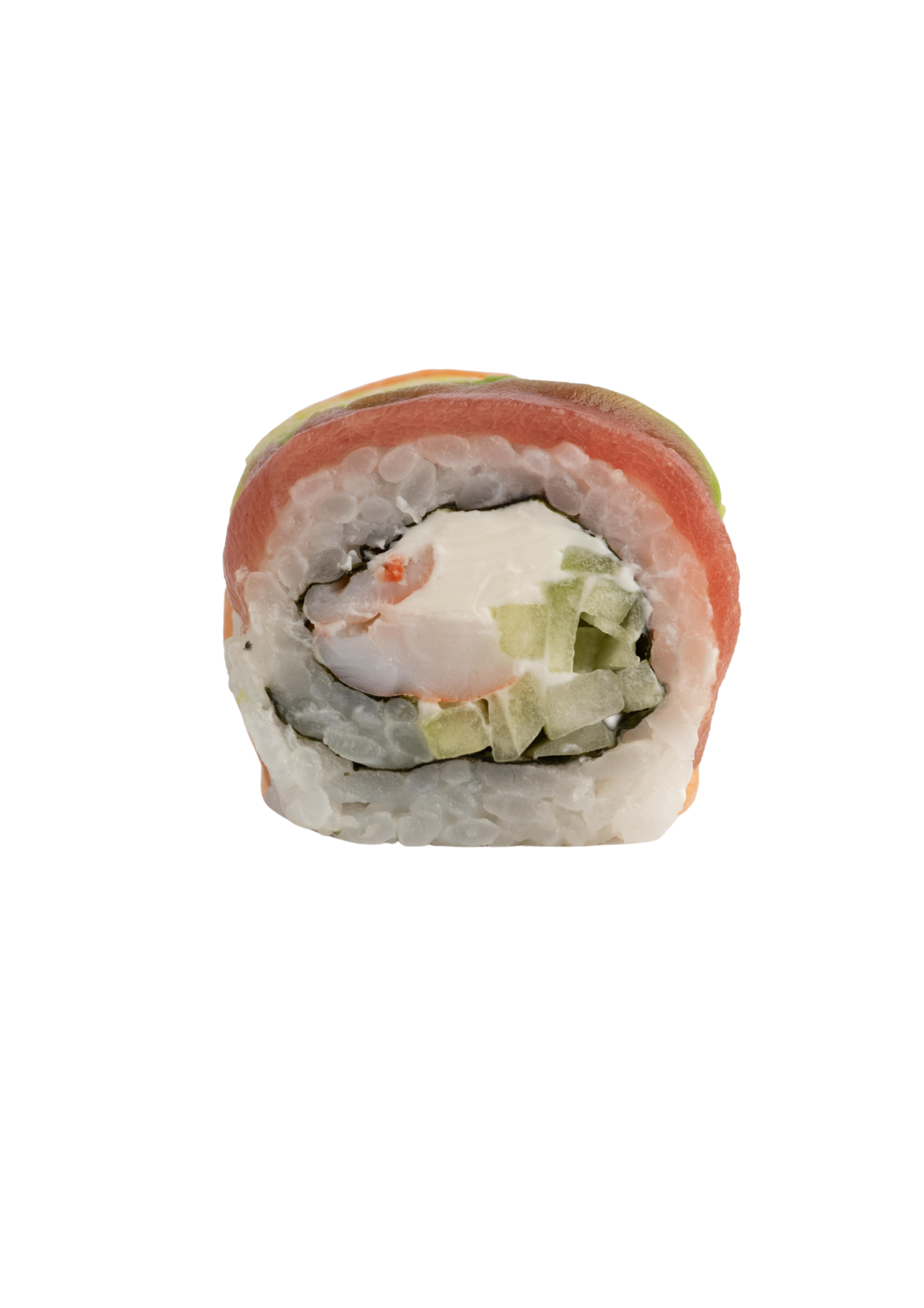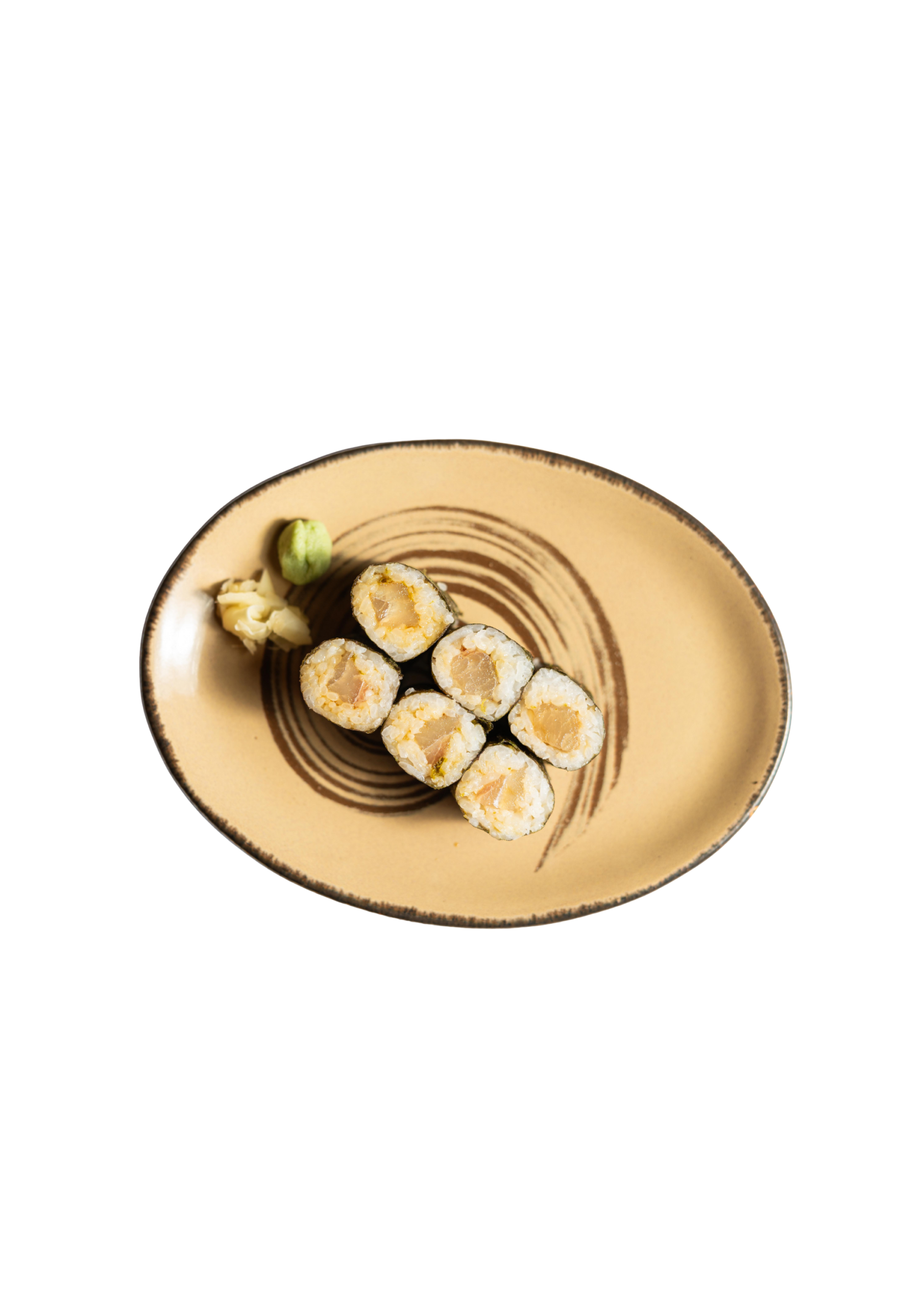 Arroz, cortes delgados de pollo salteado en salsa teriyaki , aguacate, cebollín y ajonjolí.