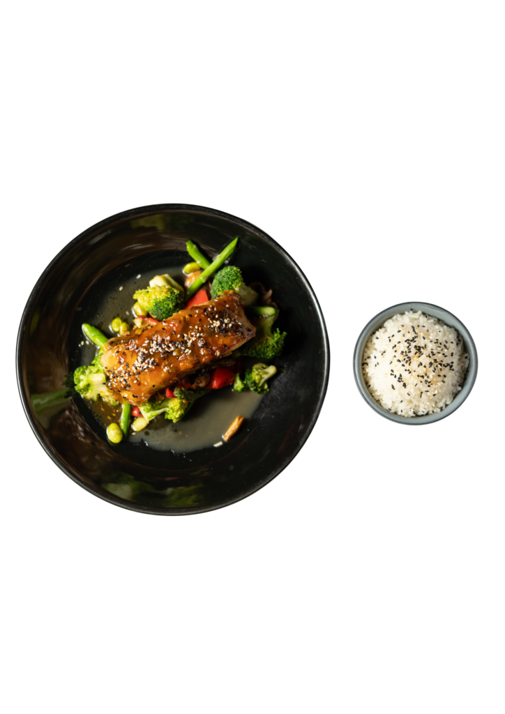 Arroz, rib-eye salteado en salsa teriyaki, cebollín, huevo cocido y ajonjolí.